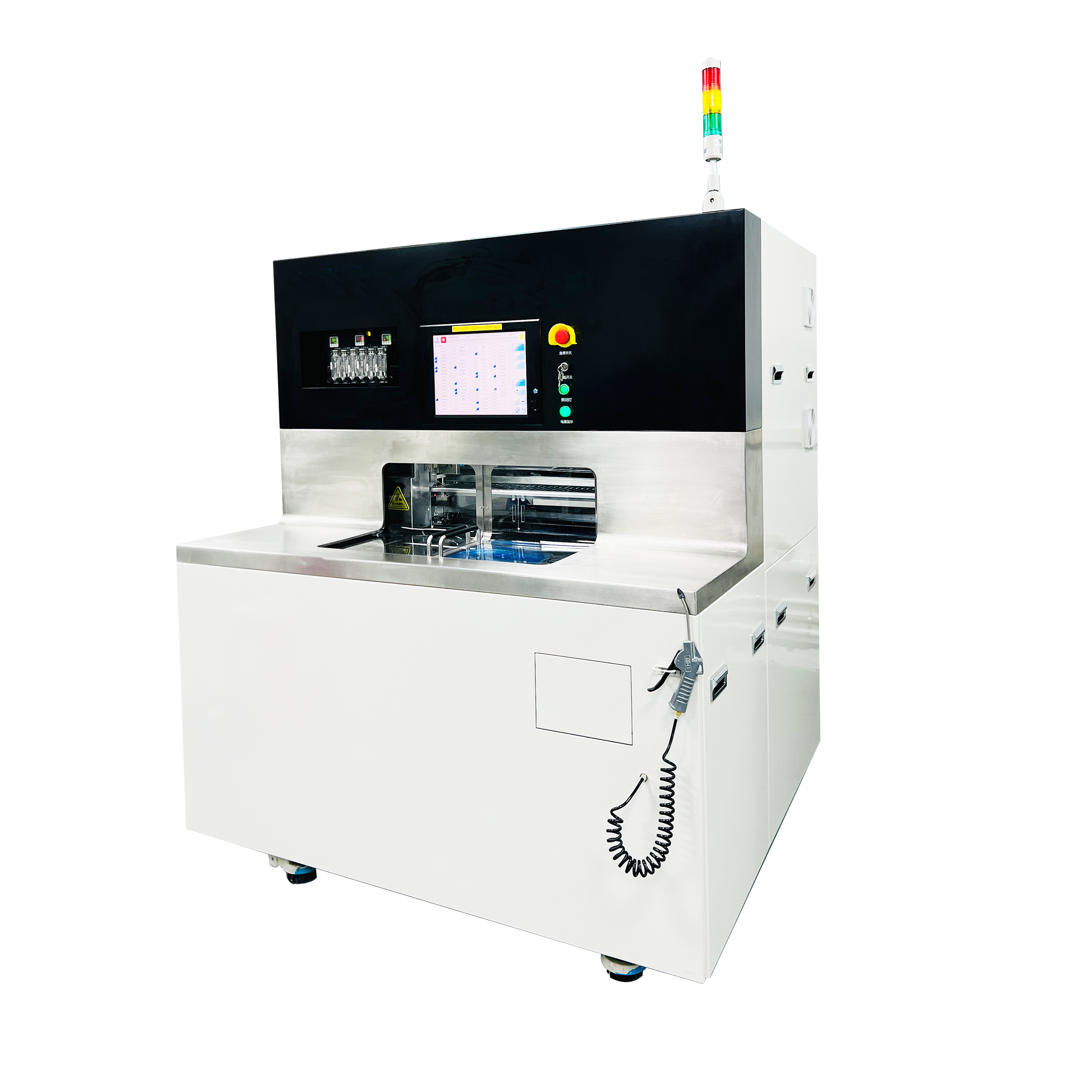 2. 上取物臂从工作盘将切割完成的材料移动到清洗盘上,进行二流体清洗和晶片干燥。